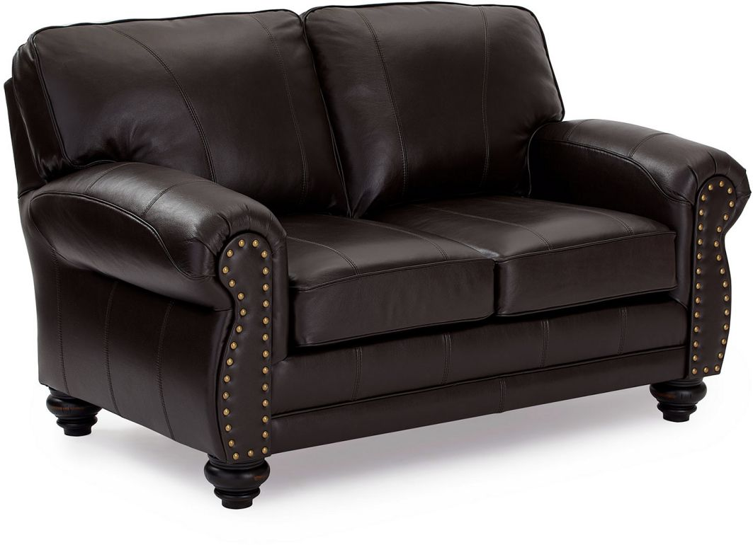 The smooth, rolled arms flow into the stepped-in back where they converge with the contoured and padded lower arms. The front of the arms are covered with face caps that are accented with brass tacks for a distinguished look. Comfort is not sacrificed by style as the cushion features encased coil springs giving a resilient, yet plush feel. Make it yours by choosing from our top-grain leather choices. Complete your look with the matching sofa and club chair. This stunning assembly rests on distinctive bun legs which are available in Espresso, Riverloom or Dark Walnut finish.