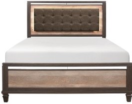 Embossed faux wood veneer presents a realistic wood-look with brown and espresso blending to create the two-tone finish. The Eastern King bed’s LED back-lit headboard softly illuminates the tufted, brown fabric insert and a mirrored strip provides decorative accent.Read More