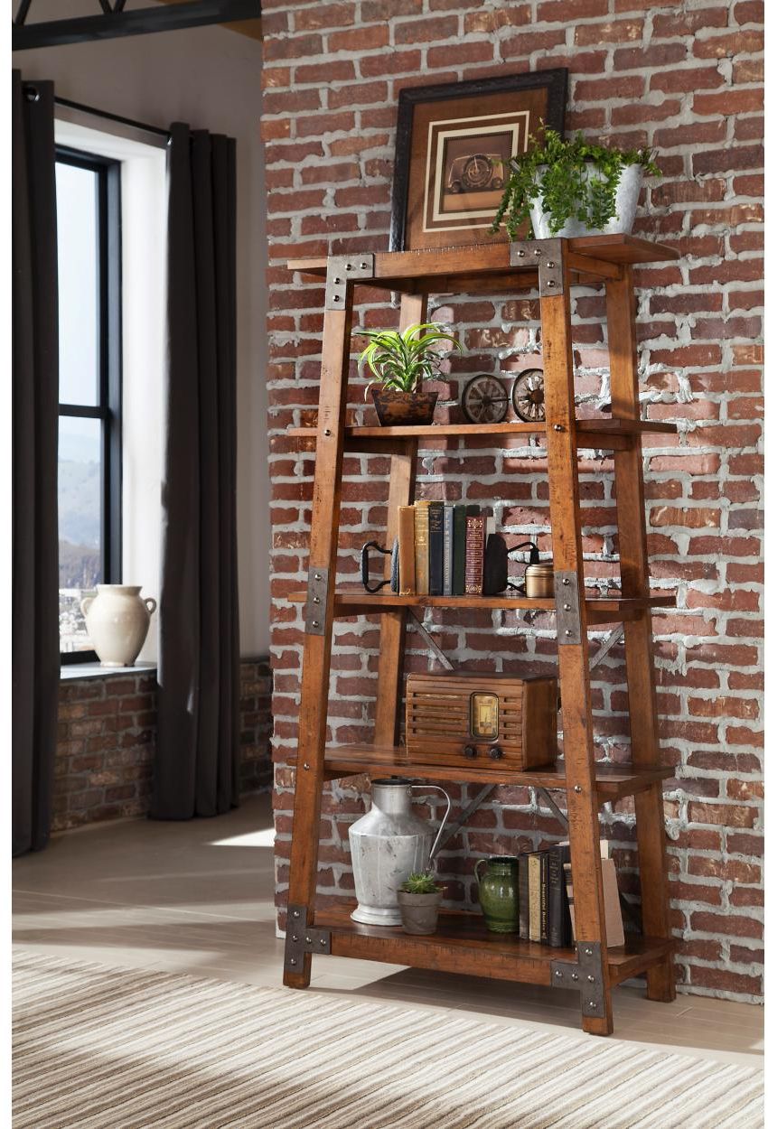 Heavily influenced by industrial design, the Halverson Collection will lend a unique look to your personal space. Wood framing provides sturdy structure and profile to this bookcase offering. Faux rivets provide additional detail to the metal bracketing that is prominently on display. A rustic brown milk crate finish is utilized to highlight the acacia veneer. Open shelving allows for prominent display of your favourite decorative items.Read More