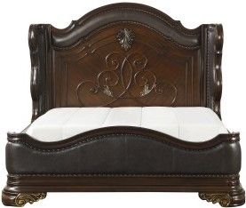 The substantial wood framing of the bed creates a distinct serpentine profile that carries into the design of the case pieces. Brown faux leather provides complementing contrast to the rich cherry finish.Read More