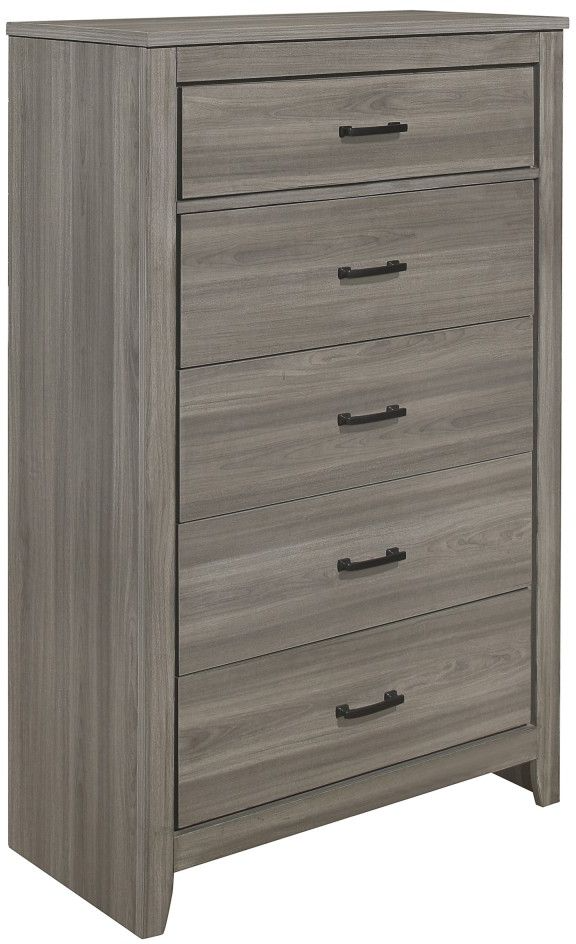 With a transitional look that lends to industrial, rustic and modern styling, the Waldorf Collection is a versatile choice for your bedroom. The printed wood grain of the performance laminate is featured in a gray tone allowing for neutral accent to your stylistic environmental choices. Horizontal accenting on the headboard and footboard creates a dramatic line that carries over to the clean design of the case pieces, each featuring distinct framing and dark, contrasting metal hardware.Read More