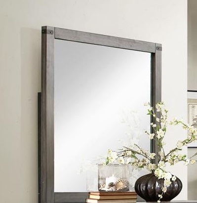 Industrial design is subtly used to achieve a cool look for your bedroom in the Woodrow Collection. Dark metal hardware and corner banding with rivet look lend to the casual look of this bedroom group. Melamine laminate features a weathered-wood look that furthers the intended design. Black bi-cast vinyl accents of the headboard provides distinct complementing contrast to the finish of the collection.Read More